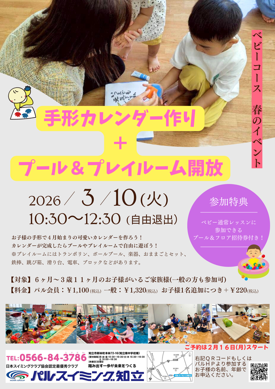 6ヶ月~3歳11ヶ月のお子様がいるご家族様対象イベントを開催します。お子様の可愛い手形をとりカレンダーをつくりましょう!また、作成後はプールやプレイルームで親子で好きな時間まで遊びましょう!